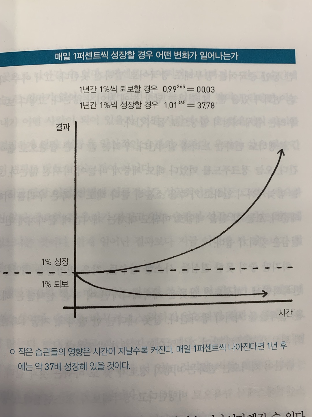 매일 1%의 성장이 1년 후에는 약 37배 성장하게 된다는 점은 독자들에게 하여금 매우 매력적으로 보이고 당장이라도 좋은 습관을 길들여 미래의 자신에게 기대를 품을 수 있게 합니다.